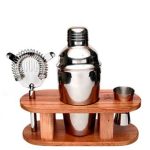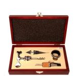 Set de Bar, excelente para regalarle a un amigo o amiga que disfrute del buen vino. Incluye : Un termómetro, sacacorchos, tapa botellas, un anillo y un dosificador, ambos anti goteo. Viene en una linda caja de madera.